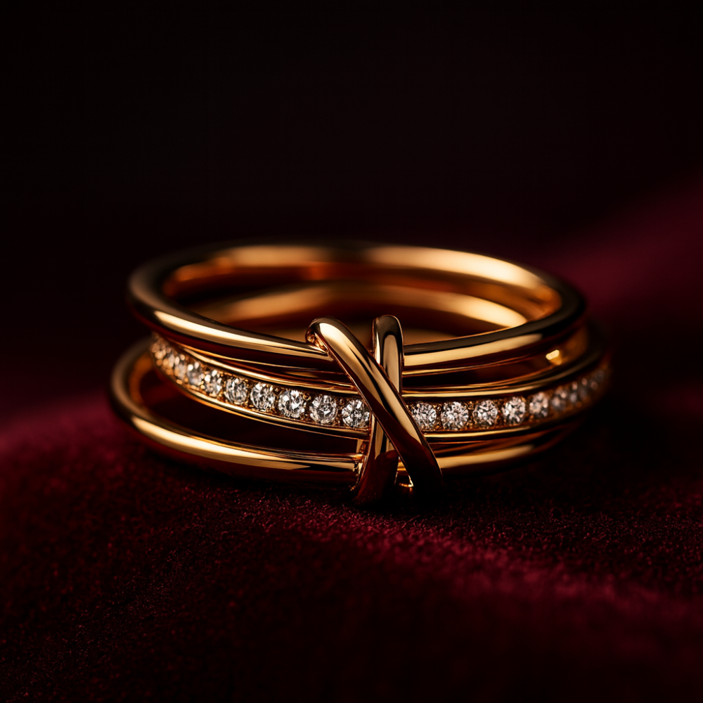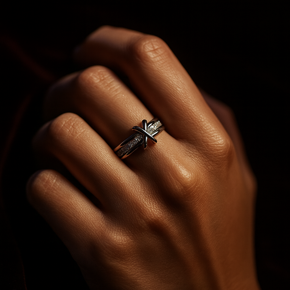 خاتم أنيق بتصميم متشابك من ثلاث حلقات، يزينه صف من المويسانيت المرصوف بدقة متناهية. يجمع بين الحداثة والرقي، ليعكس مزيجًا متوازنًا من القوة والأناقة