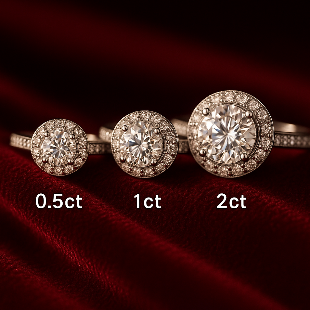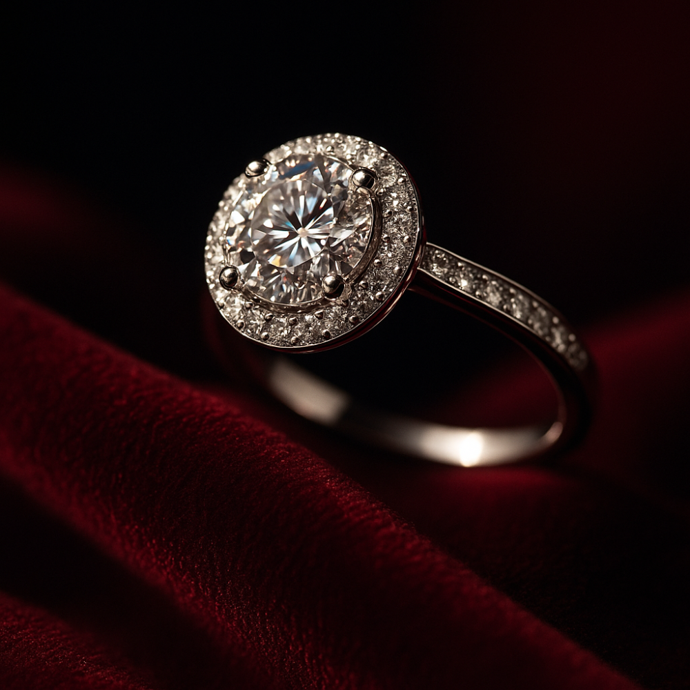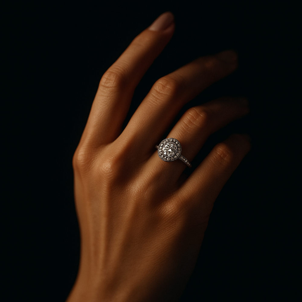 هذا الخاتم يتجلى فيه الإتقان والفخامة، مصنوع من الفضة الخالص اللامع ويزينه حجر المويسانيت مركزي بقطع دائري فاخر يتلألأ ببريق آسر. تحيط به هالة أنيقة من المويسانيت الصغير المرصع بعناية ، التصميم يجمع بين البساطة المترفة والدقة الحرفية، ليعكس ذوقًا رفيعًا وحضورًا لا يُضاهى