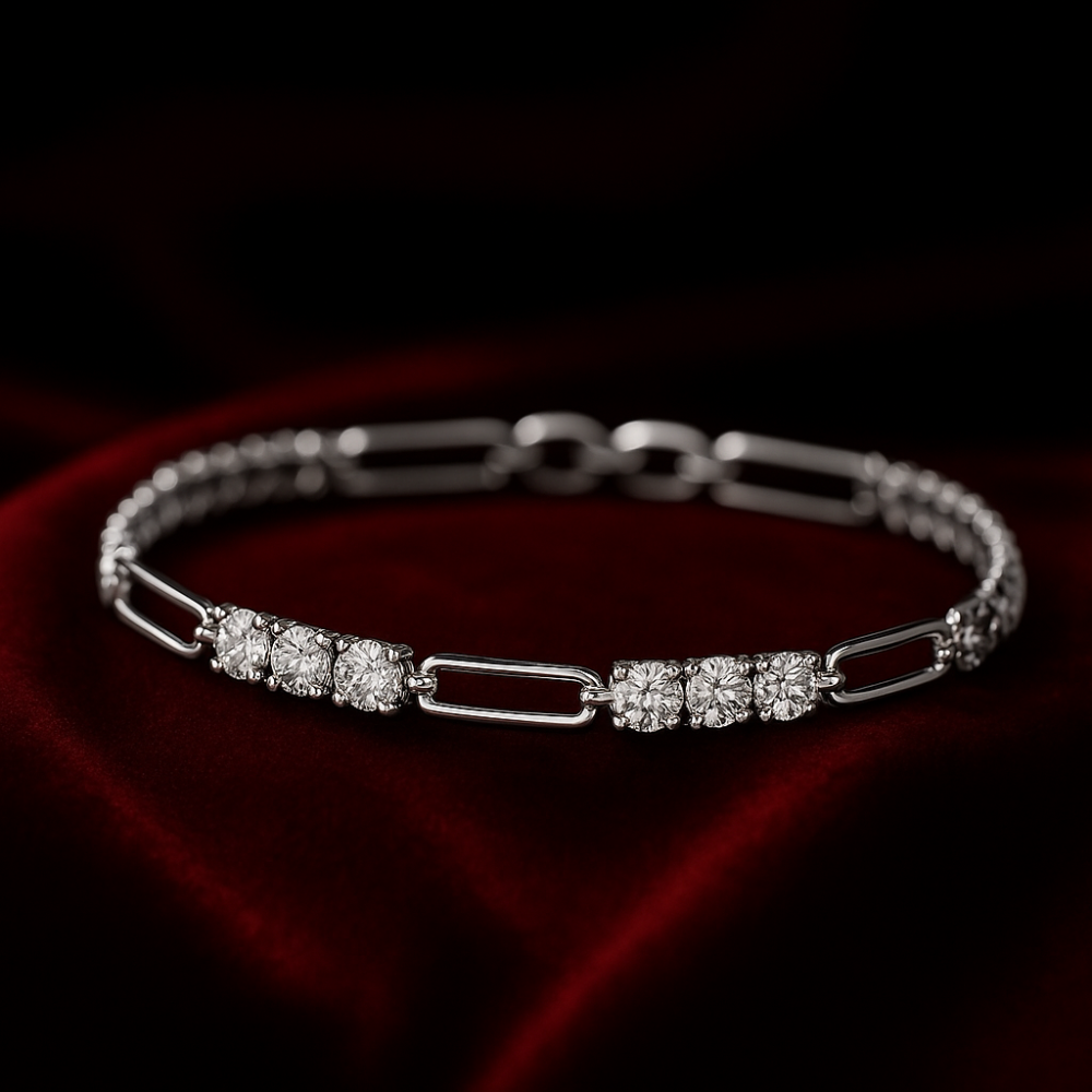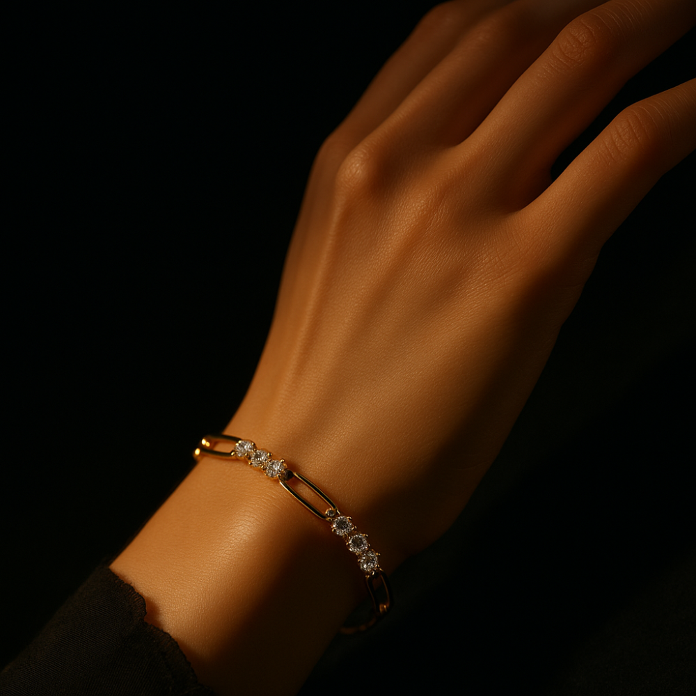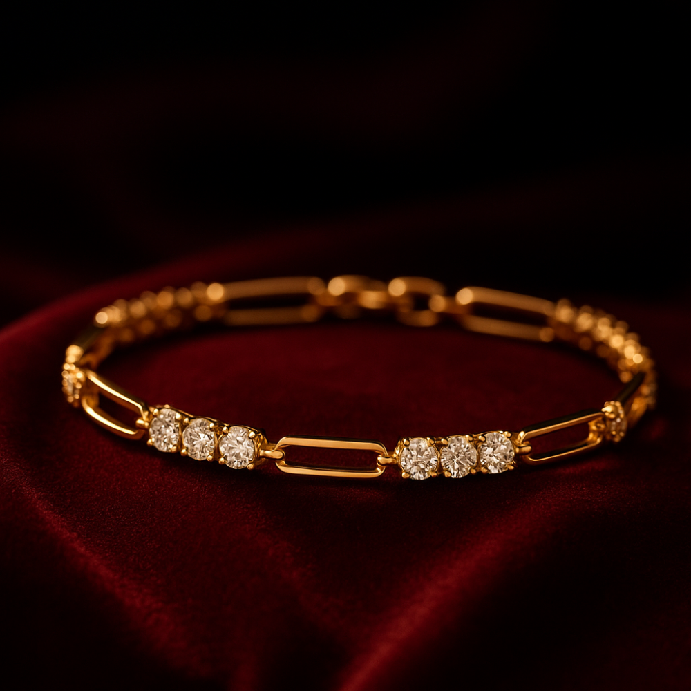 This exquisite bracelet embodies timeless elegance with a touch of modern refinement. Crafted with a delicate sequence of polished links, it is adorned with clusters of brilliant round-cut diamonds that radiate sophistication and grace. The warm golden hue enhances the brilliance of the stones, making this piece a symbol of luxury and understated glamour