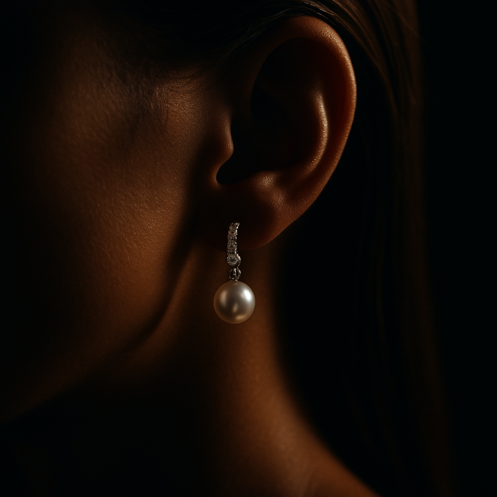 أقراط مصممة بأسلوب راقٍ، تتدلى منها لآلئ مستديرة باللون الذهبي الدافئ تشع بريقًا ناعمًا. يزين كل قرط خط رشيق من الأحجار المتألقة المثبتة بعناية، تتوّجه حجر مستديرة متألقة عند نقطة التقاء القوس باللؤلؤة، ما يمنح التصميم توازنًا وأناقة كلاسيكية ، ويجمع بين الفخامة الهادئة والذوق الرفيع
