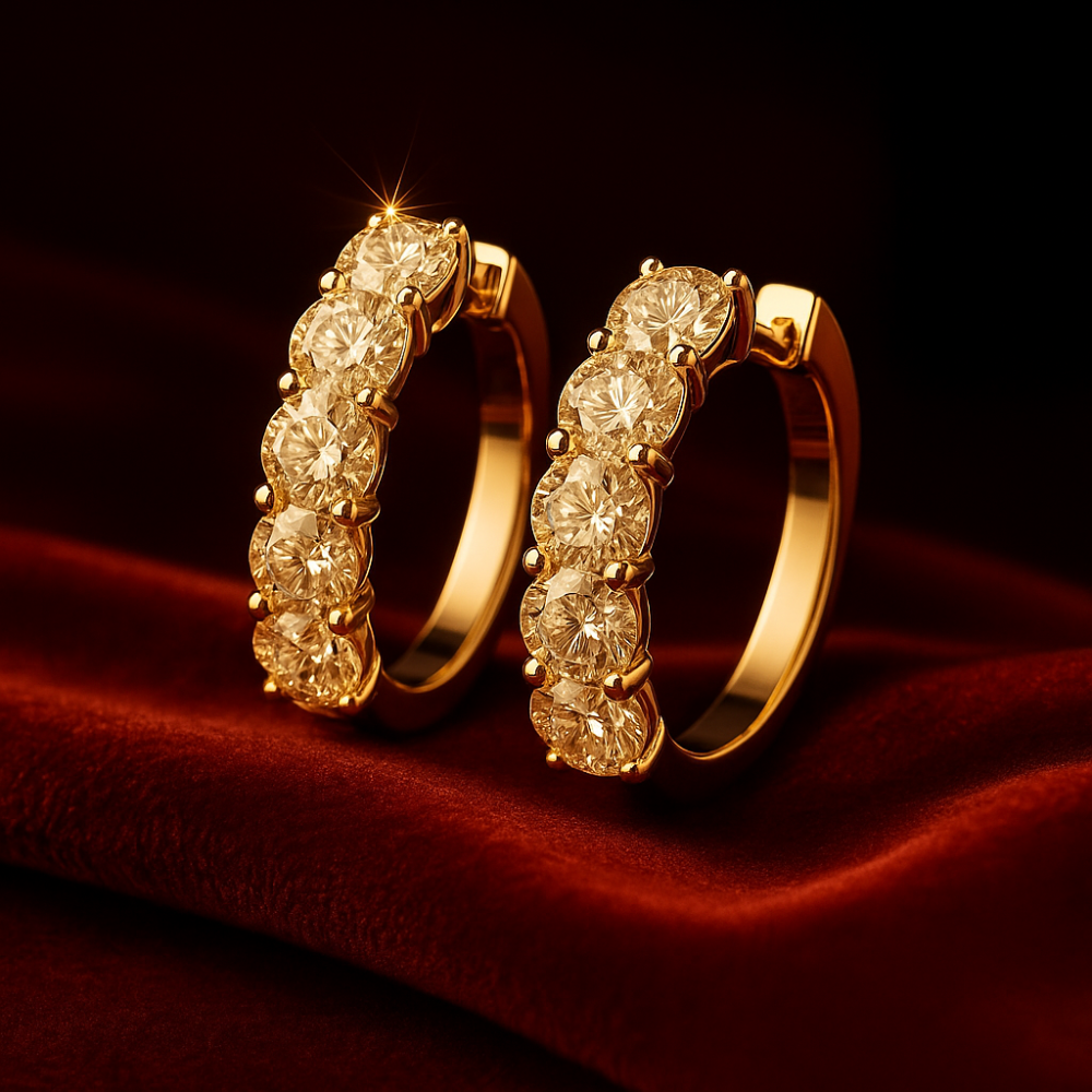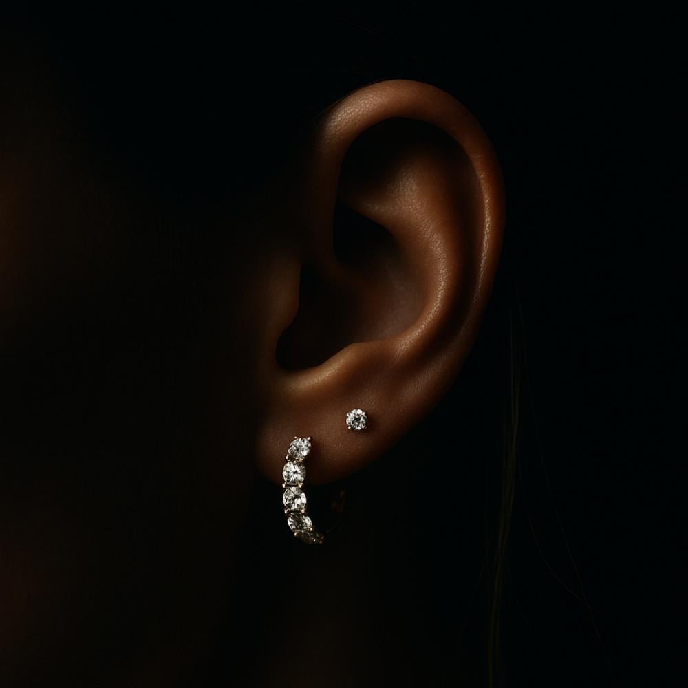 أقراط حلقية فاخرة، مرصعة بعناية بصف متقن من أحجار المويسانايت المستديرة بقطع لامع، كل حجر منها مثبت ببراعة بمخالب دقيقة تكشف عن نقائه المتألق. يتدرج انسياب الأحجار بسلاسة على امتداد نصف الدائرة، لينثر بريقاً راقياً يضيء الإطار بأناقة. ابتكار متوازن بإتقان يجسد مزيجاً بين الأناقة والعملية العصرية، مكتمل بإغلاق محكم يضمن راحة وثباتاً يمنحان ثقة تدوم طوال اليوم