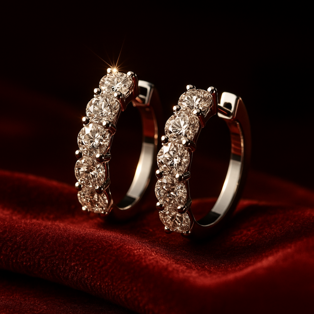 Luxurious hoop earrings, meticulously set with a refined row of round brilliant-cut Moissanite, each expertly secured in delicate prongs to reveal its radiant purity. The seamless flow of the diamonds along half the circle scatters an elegant brilliance that illuminates the frame with grace. A perfectly balanced creation that embodies the harmony of timeless elegance and modern practicality, completed with a secure fastening that ensures lasting comfort and confidence throughout the day