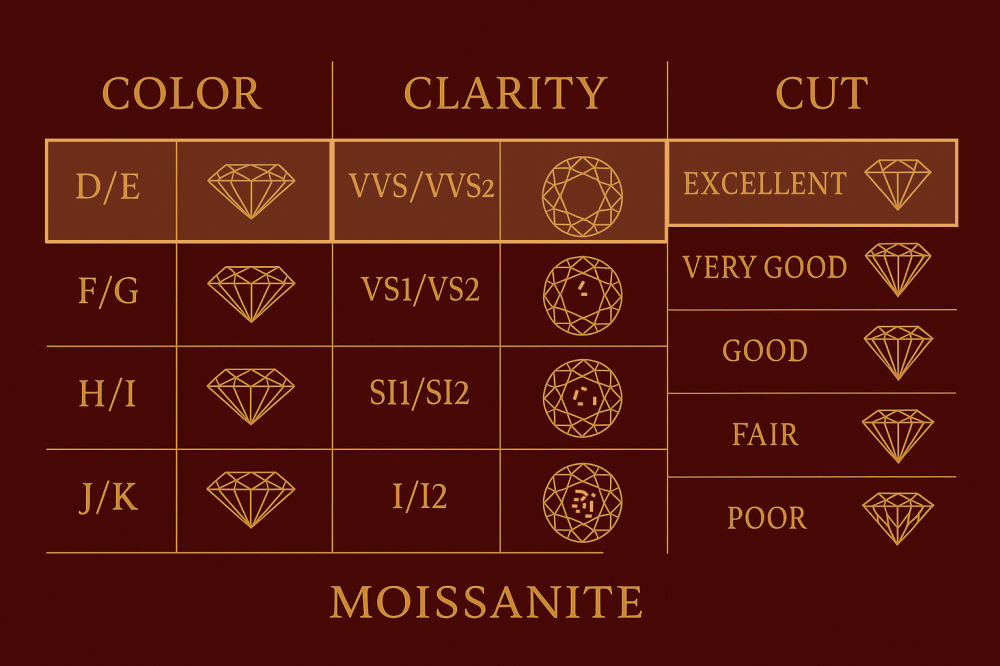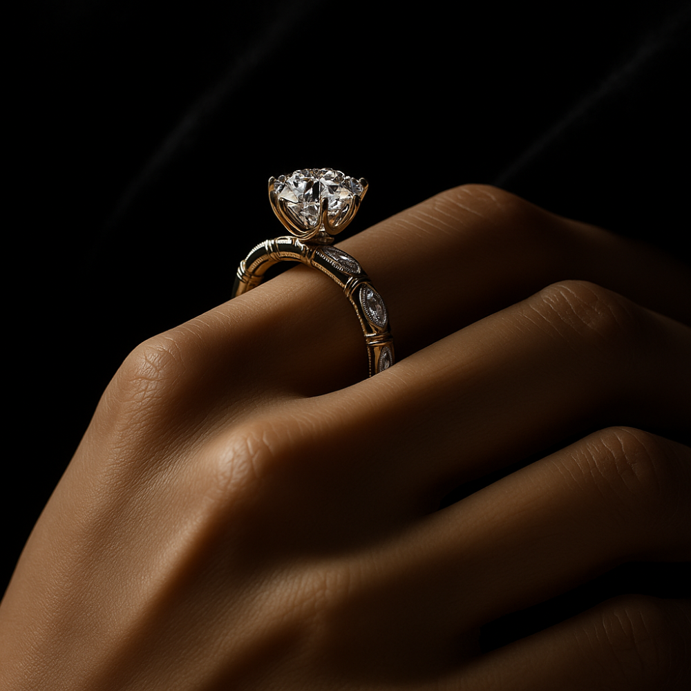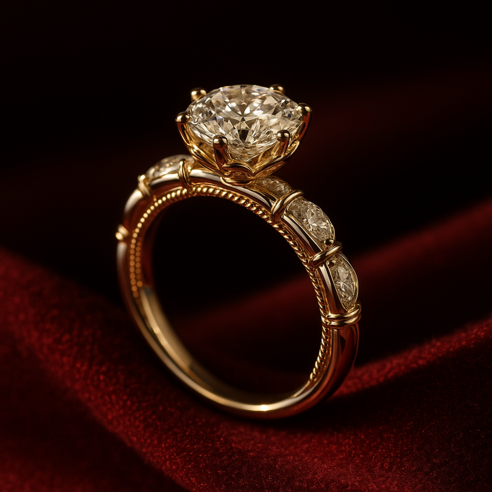This distinguished ring embodies refined elegance, crowned with a brilliant round-cut moissanite stones that commands attention at the center. The band is adorned with smaller accent moissanite, each precisely set to enhance the design’s radiance, while delicate details along the shank add a touch of timeless sophistication. A perfect harmony of craftsmanship and luxury