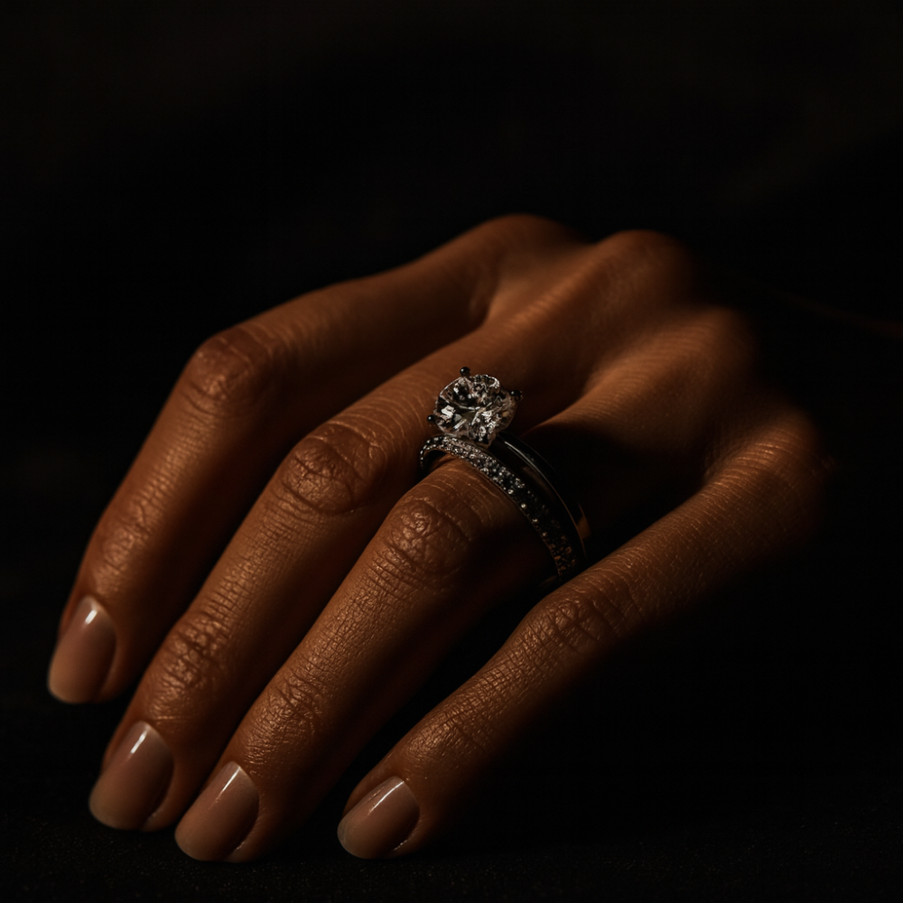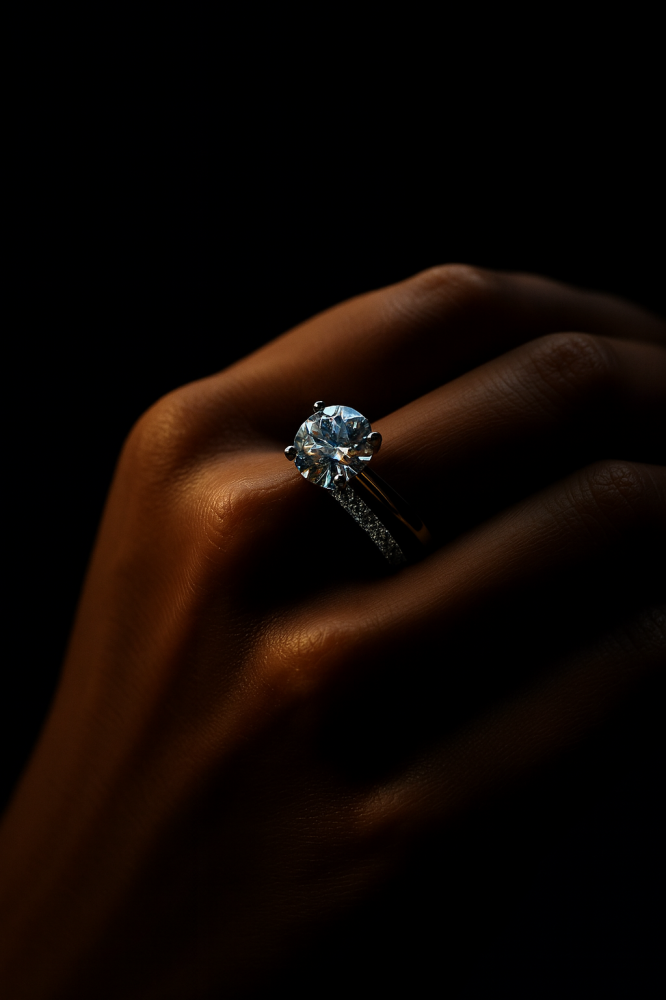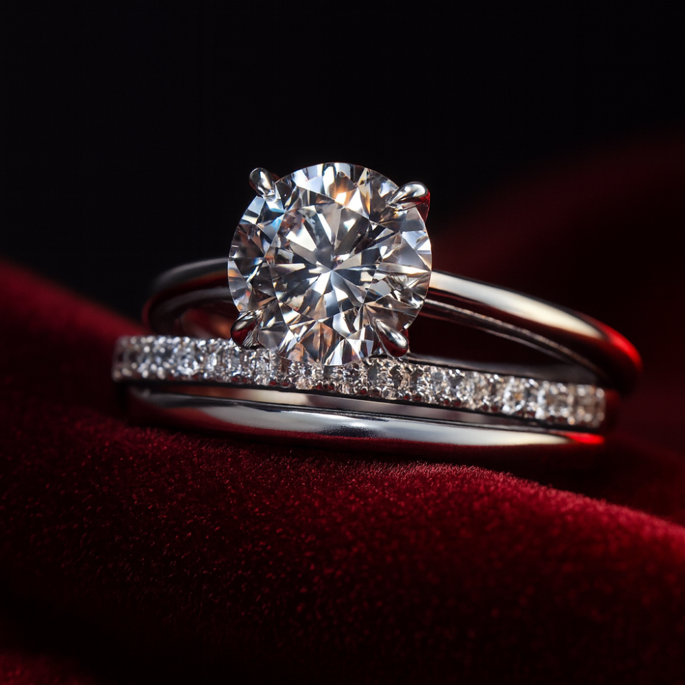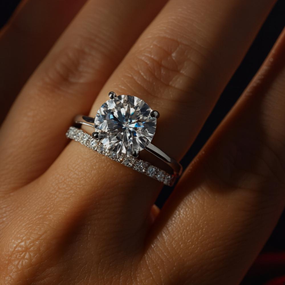 A ring of timeless elegance, crowned with a breathtaking round-cut stones, gracefully embraced by a polished white gold setting. Delicately adorned with smaller moissanite along its sides, it radiates a brilliance that embodies luxury and sophistication in every detail