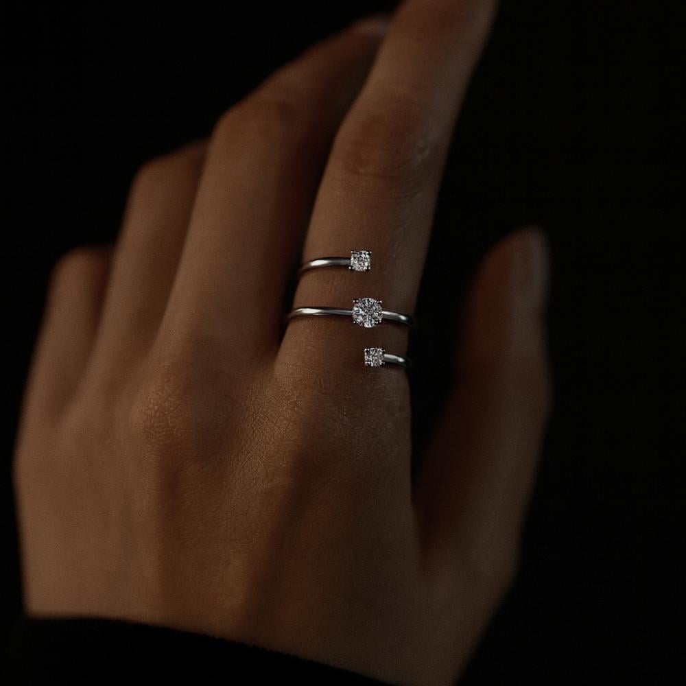 خاتم عصري بتصميم ثلاثي الأحجار، يضم ثلاث أحجار مويسانيت مستديرة بأحجام متدرجة على سوار مفتوح وأنيق. يتميز بتصميمه البسيط الذي يبرز النقاء والأناقة